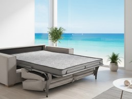 Con el modelo Dell se ha buscado una buena sintonía entre cama y sofá. Utiliza un mecanismo interno de mallas electro soldadas y un colchón en espuma de alta densidad. Su versatilidad permite disponer de varias medidas de somier.
