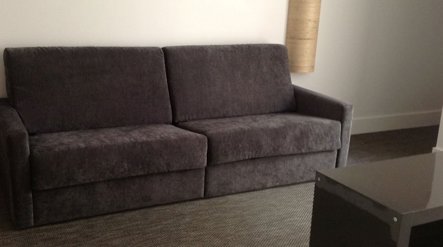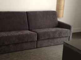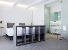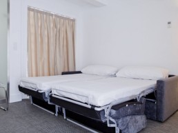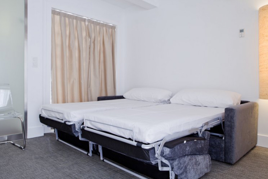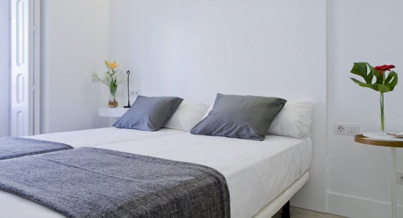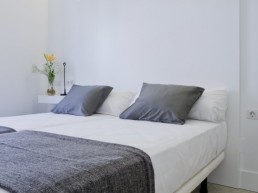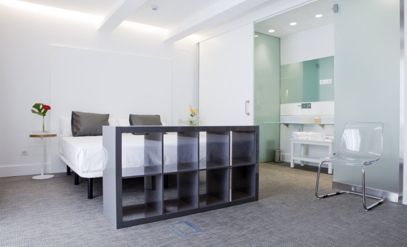 El mobiliario simple deja paso a la elegancia, fabricado en DM lacado y con estanterías metálicas aprovechando cada espacio de la habitación.