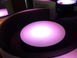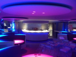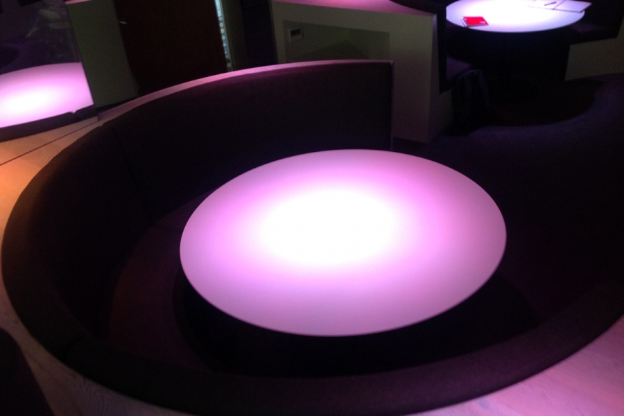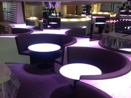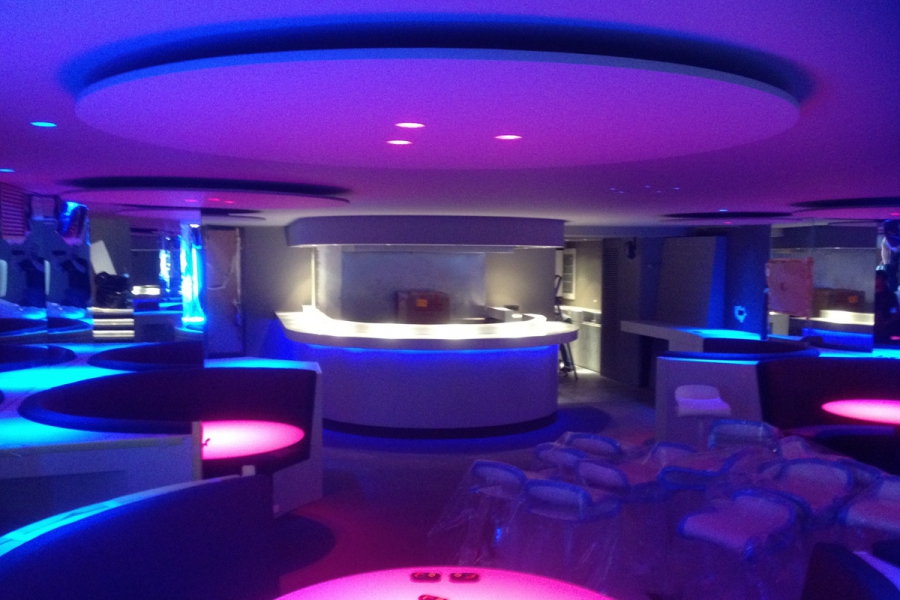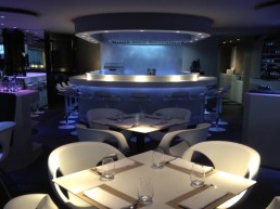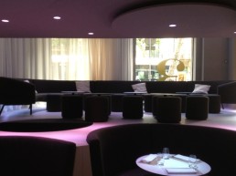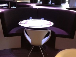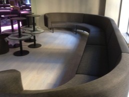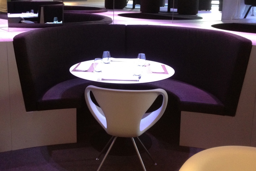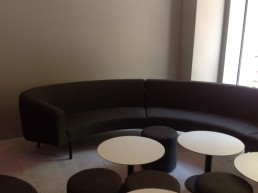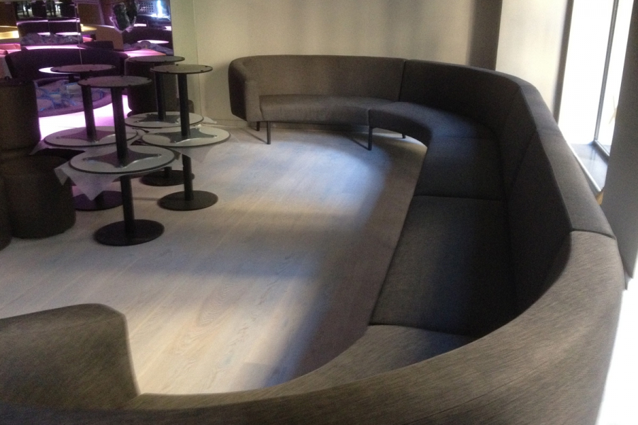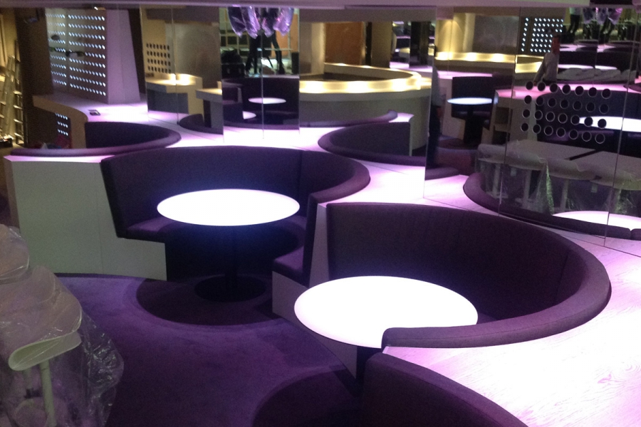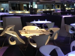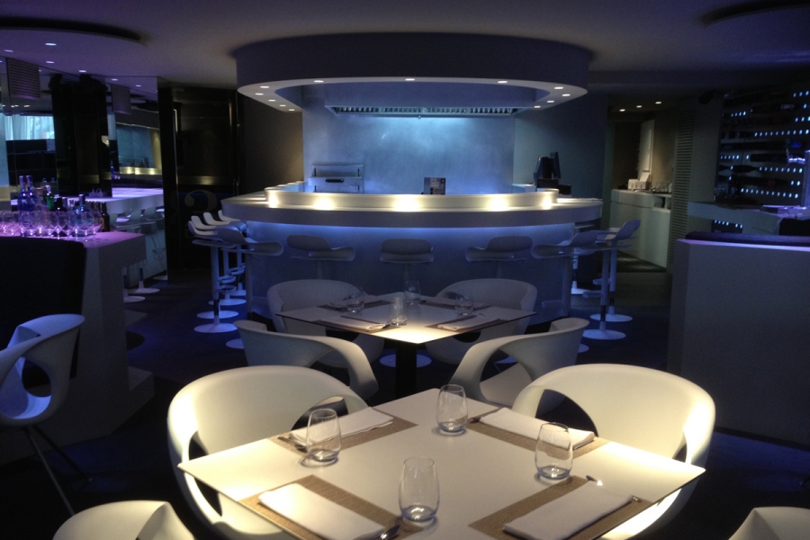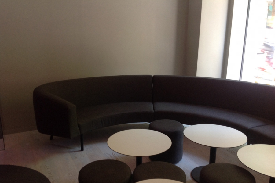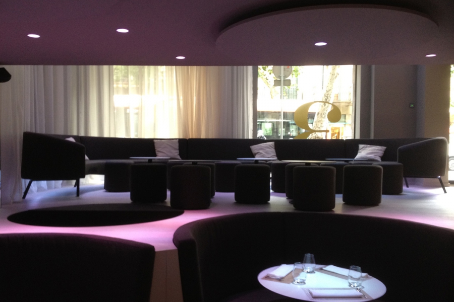 Una obra donde las formas curvas son las protagonistas, las bancadas en forma circular encajar perfectamente en el proyecto. Su espectacular sofá en la entrada acompañado de unos puffs y unas mesas bajas dan al local dos espacios diferentes.