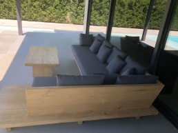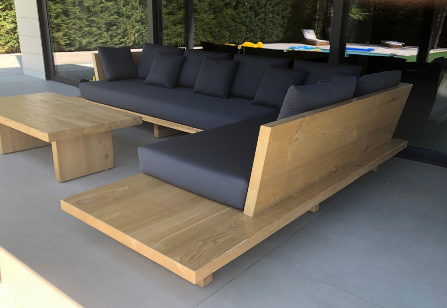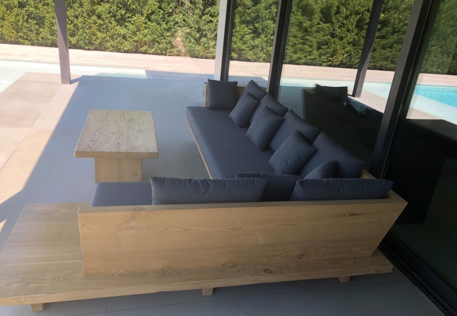 Una estructura en roble macizo de 80 mm y acabada en barniz especial para intemperie.